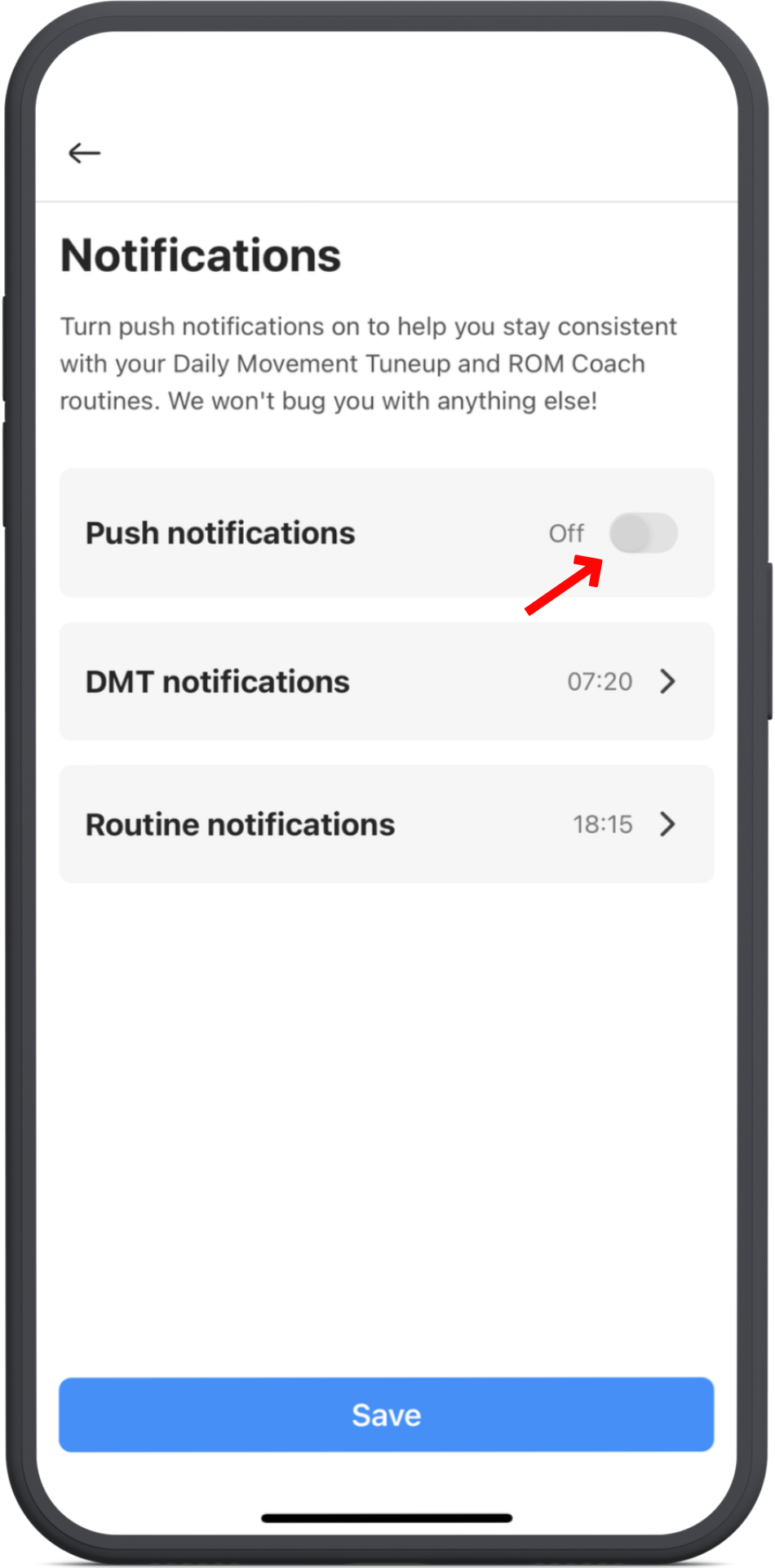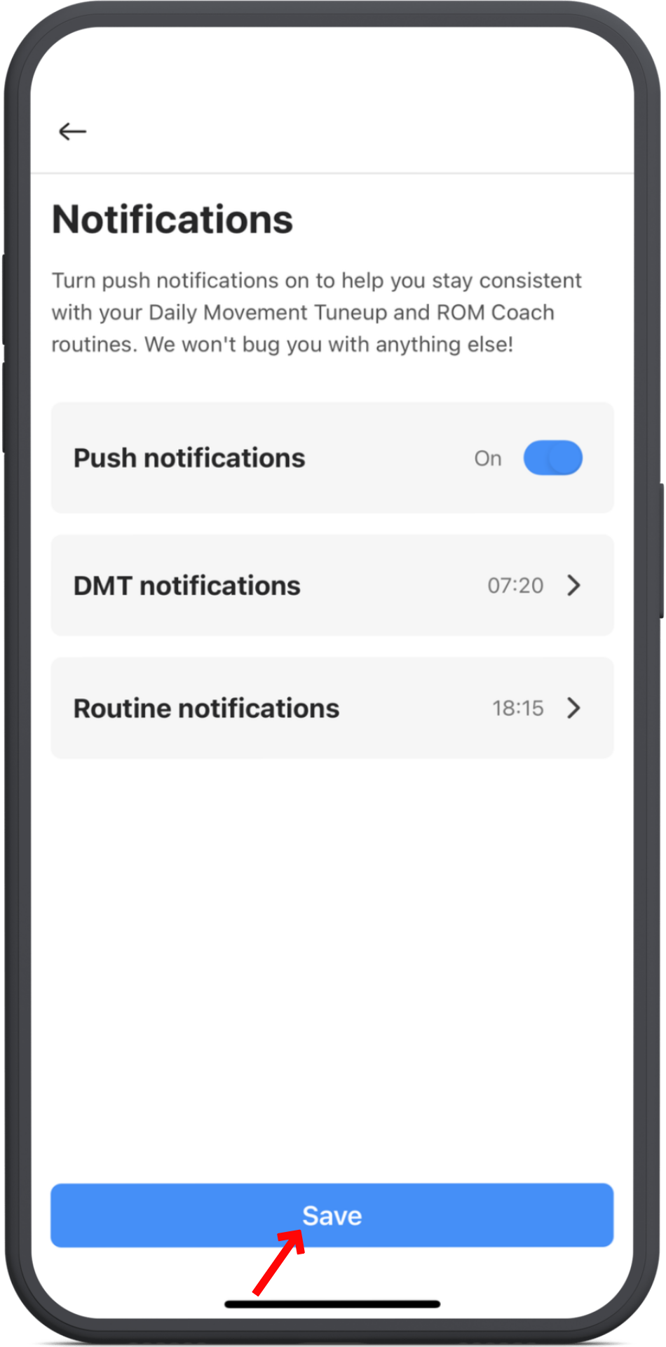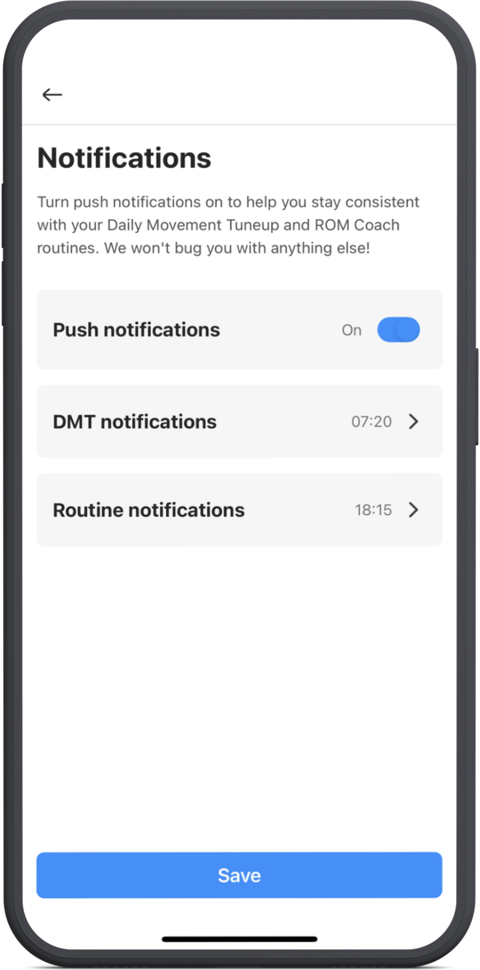 Push notifications are alert messages generated by ROM Coach that display reminders on your device. Even if the app is closed, you can stay on track with your daily movement tune-ups (DMT) and routines.